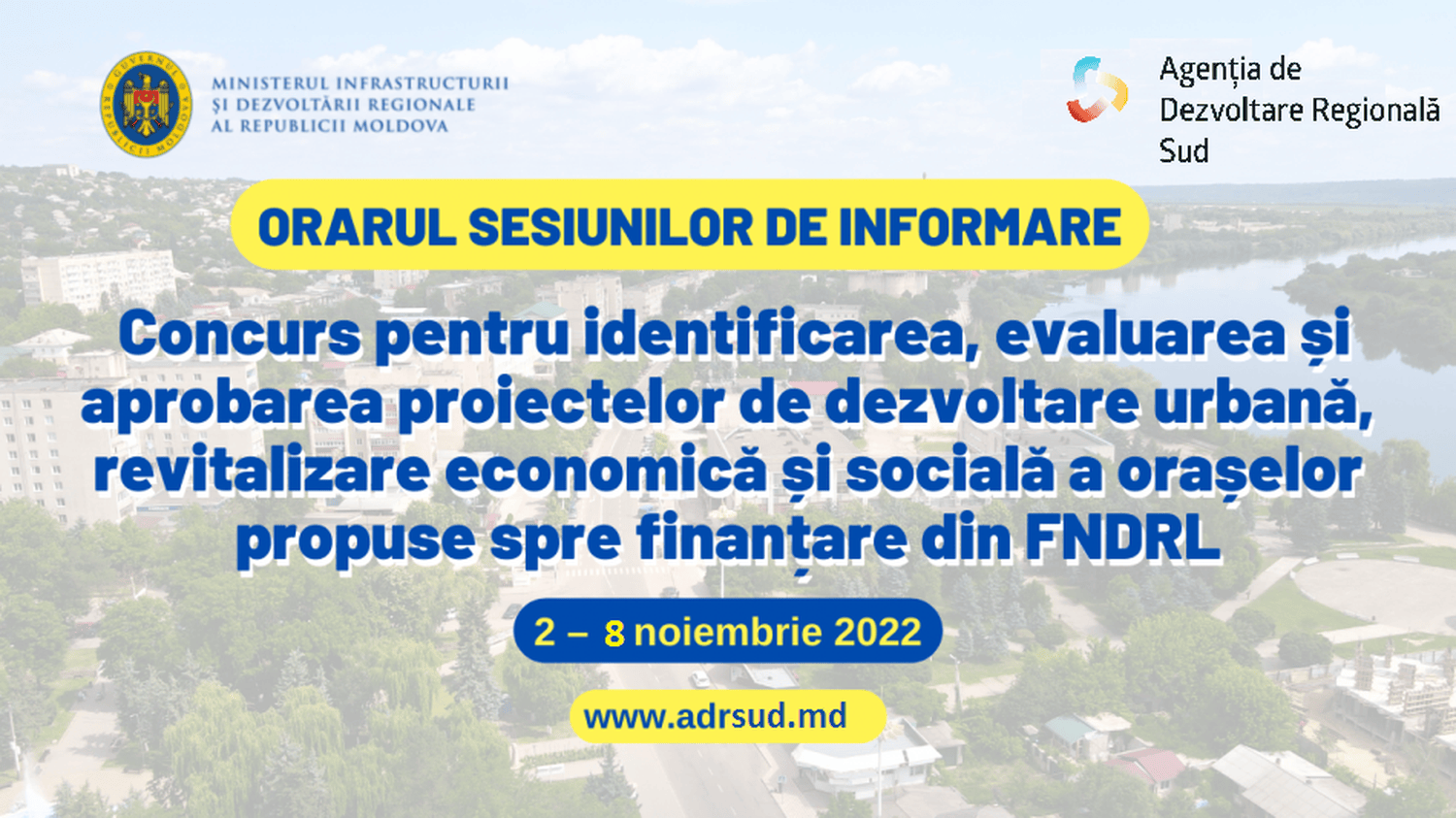 597 Accesări Agenția de Dezvoltare Regională (ADR) Sud invită autoritățile publice locale din municipiul Cahul — oraș-pol de creștere, și din orașele care au aprobate Programele de revitalizare urbană (PRU) sau care sunt în proces de elaborare / actualizare a PRU din Regiunea de Dezvoltare Sud să participe la o serie de sesiuni de informare privind modul de participare la Concursul pentru identificarea, evaluarea și aprobarea proiectelor de dezvoltare urbană, revitalizare economică și socială a orașelor propuse spre finanțare din Fondul Național pentru Dezvoltare Regională și Locală, lansat de Ministerul Infrastructurii și Dezvoltării Regionale la 1 noiembrie 2022. Sesiunile de informare vor avea loc în perioada 2-8 noiembrie curent, conform următorului orar: