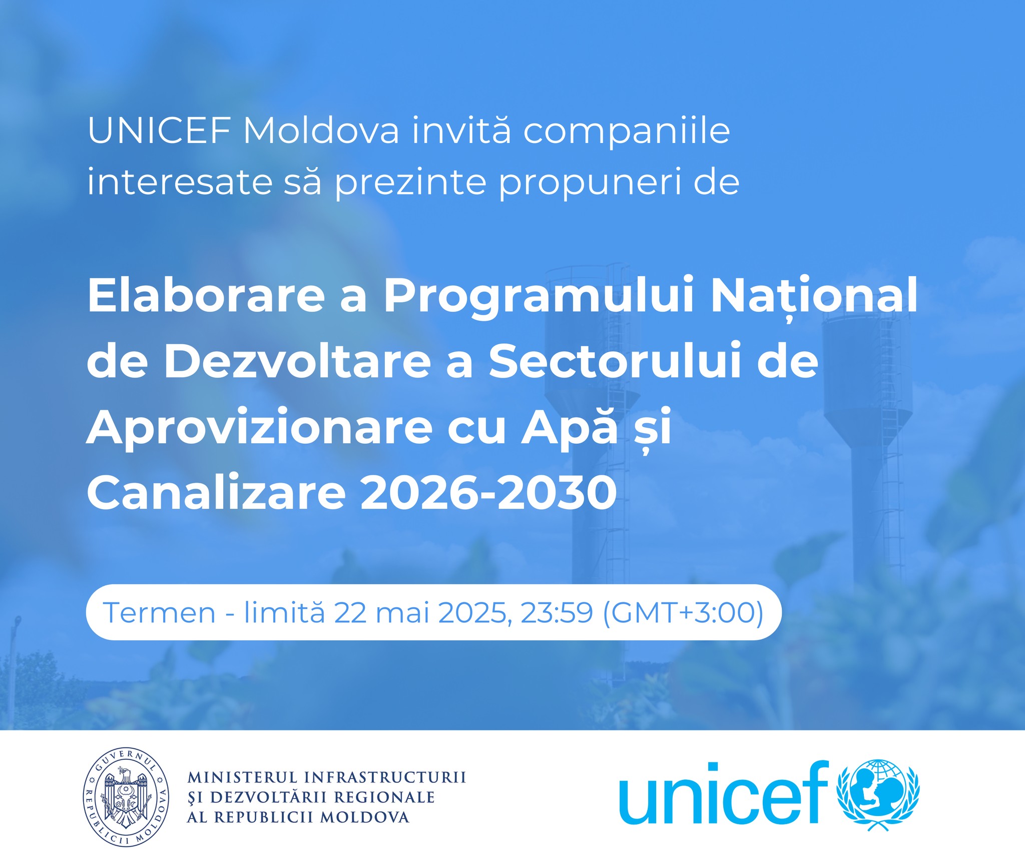 289 Accesări MIDR//https://midr.gov.md/noutati/a-fost-lansata-licitatia-internationala-pentru-elaborarea-programului-national-de-dezvoltare-a-sectorului-de-aprovizionare-cu-apa-si-canalizare-2026-2030UNICEF Moldova a lansat procedura de achiziții publice internaționale pentru selectarea unei companii care va sprijini Ministerul Infrastructurii și Dezvoltării Regionale în elaborarea Programului Național de Dezvoltare a Sectorului de Aprovizionare cu Apă și Canalizare pentru perioada 2026-2030. Scopul acestei misiuni este de a sprijini Ministerul Infrastructurii și Dezvoltării Regionale în elaborarea Programului național de dezvoltare a sectorului de alimentare cu apă și canalizare pentru perioada 2026-2030, evaluând, în același timp, progresele înregistrate în ceea ce privește angajamentele asumate în cadrul ODD 6 și aliniind planul la obiectivele asumate în temeiul angajamentului față de Directiva-cadru a UE privind apa, Directiva UE privind apa potabilă 2020/2184, Directiva UE privind tratarea apelor urbane reziduale 91/271/CEE. Scopul acestei activități este de a pregăti un Program Național de Dezvoltare a Sectorului de Aprovizionare cu Apă și Canalizare în conformitate cu prevederile Hotărârii Guvernului nr. 386/2020 privind planificarea strategică, care va include răspunsuri la cel puțin următoarele aspecte: