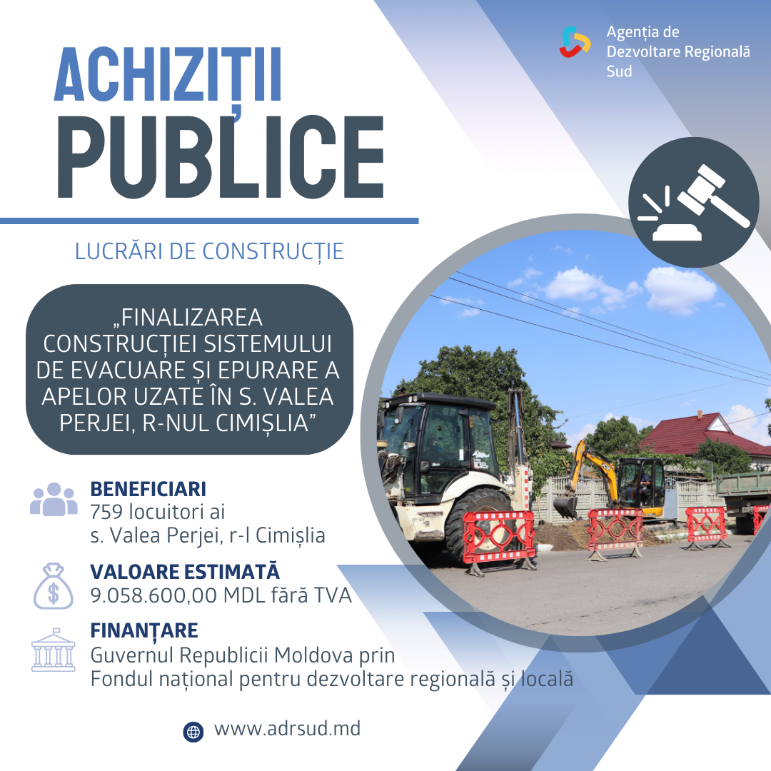 Agenția de Dezvoltare Regională Sud a lansat procedura de achiziție publică pentru executarea lucrărilor de construcție în cadrul proiectului „Finalizarea construcției sistemului de evacuare și epurare a apelor uzate în s. Valea Perjei, r-nul Cimișlia”. Lucrările prevăd construcția a 3 stații de pompare a apelor uzate și amenajarea platformelor, construcția a 250 m.l. rețea de canalizare și reabilitarea căminelor de canalizare existente (234 buc). Prin implementarea acestui proiect, 759 de locuitori ai satului Valea Perjei vor beneficia de acces la servicii de canalizare moderne, contribuind astfel la îmbunătățirea condițiilor de trai, reducerea riscurilor de mediu și protejarea sănătății publice. Rețeaua va fi conectată la stația de epurare a apelor uzate din satul Ecaterinovca, asigurând astfel un sistem eficient și sustenabil de gestionare a apelor reziduale.