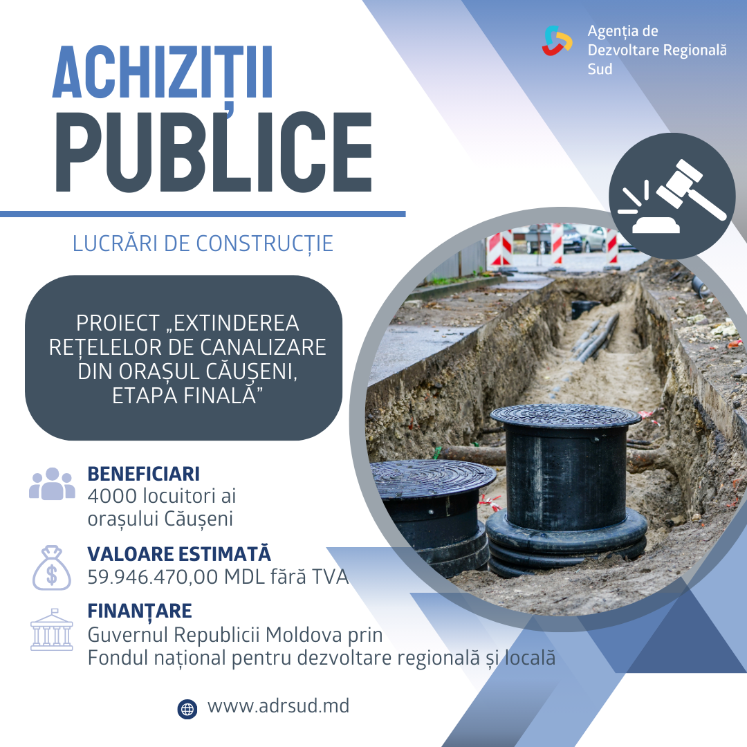 Agenția de Dezvoltare Regională Sud a lansat procedura de achiziție publică pentru executarea lucrărilor de construcție în cadrul proiectului „Extinderea rețelelor de canalizare din orașul Căușeni, etapa finală”. Lucrările prevăd construcția a 4 stații de pompare a apelor uzate și amenajarea platformelor, construcția a 38 km de rețele de canalizare în orașul Căușeni. Prin implementarea acestui proiect, circa 4000 de locuitori ai orașului vor beneficia de acces la servicii de canalizare moderne, contribuind astfel la îmbunătățirea condițiilor de trai, reducerea riscurilor de mediu și protejarea sănătății publice. Rețelele vor fi conectate la Stația de epurare a apelor uzate, recent modernizată, iar prin realizarea acestui proiect, orașul Căușeni va fi acoperit integral cu acces la servicii publice de sanitație. Detalii despre procedura de achiziții: