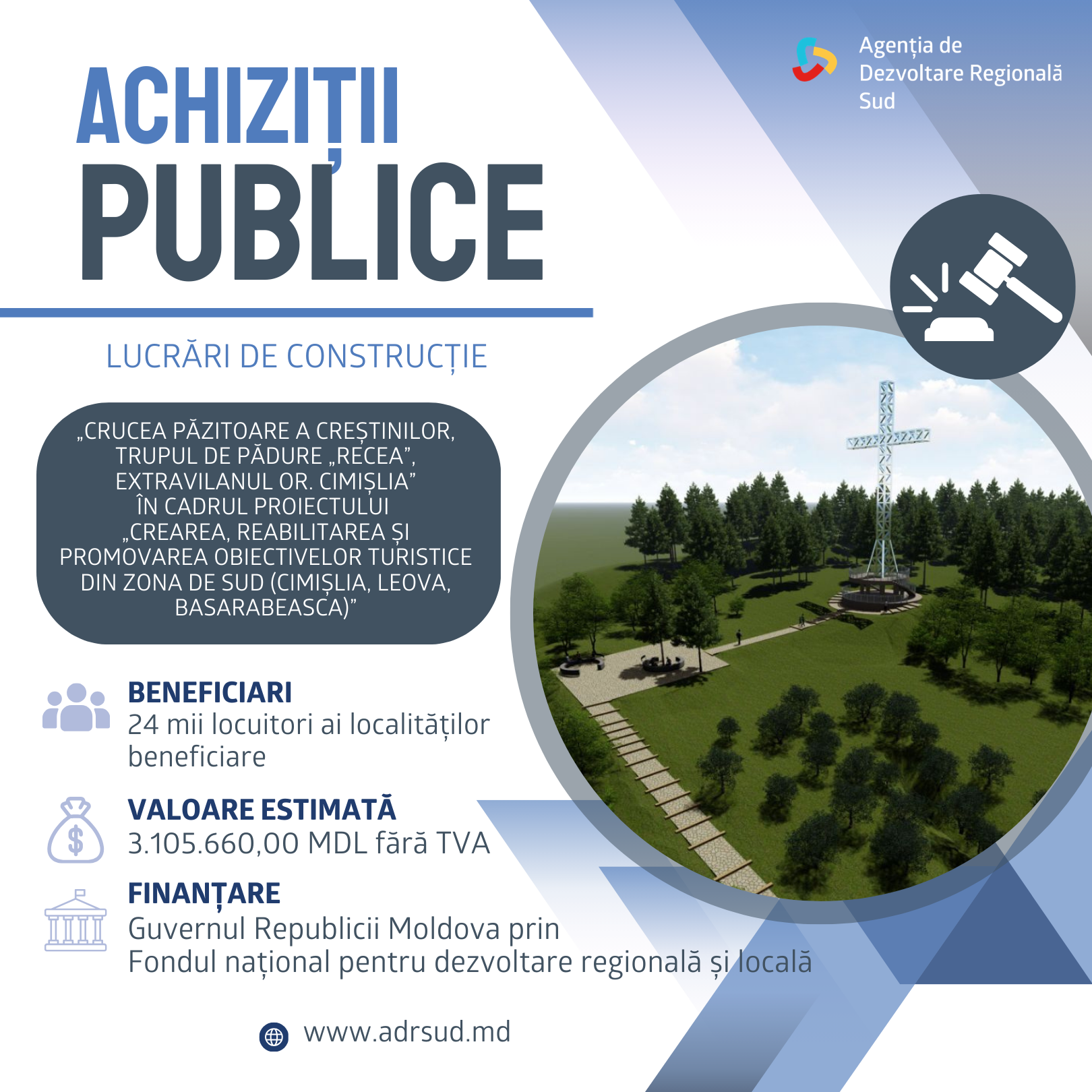 Prima - Achiziții Publice - Anunțuri proceduri finanțate din FNDRL - Achiziționarea lucrărilor de construcție „Crucea Păzitoare a Creștinilor, Trupul de pădure „Recea”, extravilanul or. Cimișlia” în cadrul proiectului „Crearea, reabilitarea și promovarea obiectivelor turistice din zona de sud (Cimișlia, Leova, Basarabeasca)”