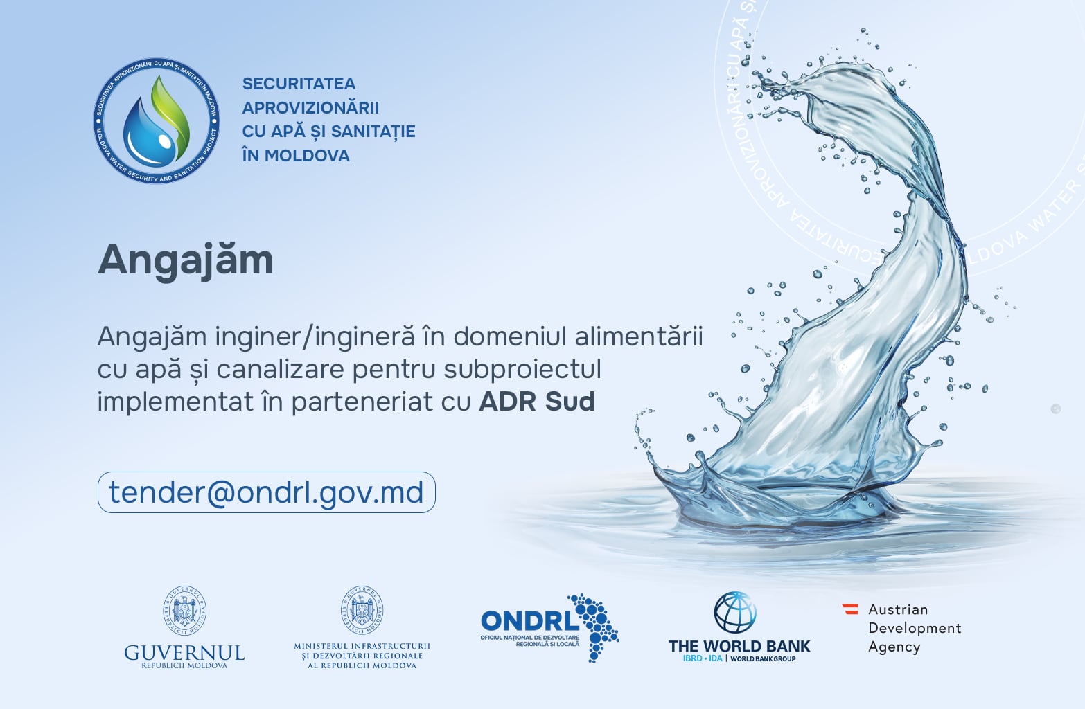 În cadrul proiectului Securitatea aprovizionării cu apă și sanitație în Moldova (SAASM), a fost lansat repetat concursul pentru selectarea unui inginer sau unei inginere în domeniul alimentării cu apă și canalizare (AAC), care va sprijini Agenția de Dezvoltare Regională Sud în implementarea subproiectului „Extinderea și îmbunătățirea serviciilor de alimentare cu apă în raioanele Cahul și Vulcănești".