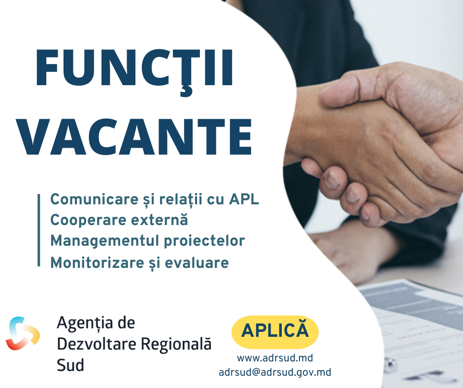 Agenția de Dezvoltare Regională Sud anunță concurs pentru ocuparea funcțiilor vacante în cadrul secțiilor: 1. Secția managementul integrat al proiectelor: Specialist în monitorizarea proiectelor – 1 unitate (perioadă nedeterminată), 2 unități (perioadă determinată) - detalii aici. 2. Secția monitorizare și evaluare: Specialist în monitorizare și evaluare – 2 unități (perioadă nedeterminată) - detalii aici. 3. Secția planificare și cooperare regională: Specialist în comunicare și relații cu APL/CRD – 1 unitate (perioadă nedeterminată) - detalii aici. Specialist cooperare externă – 1 unitate (perioadă nedeterminată) - detalii aici. Specialist în planificare – 1 unitate (perioadă determinată) - detalii aici. Condiții de bază:
