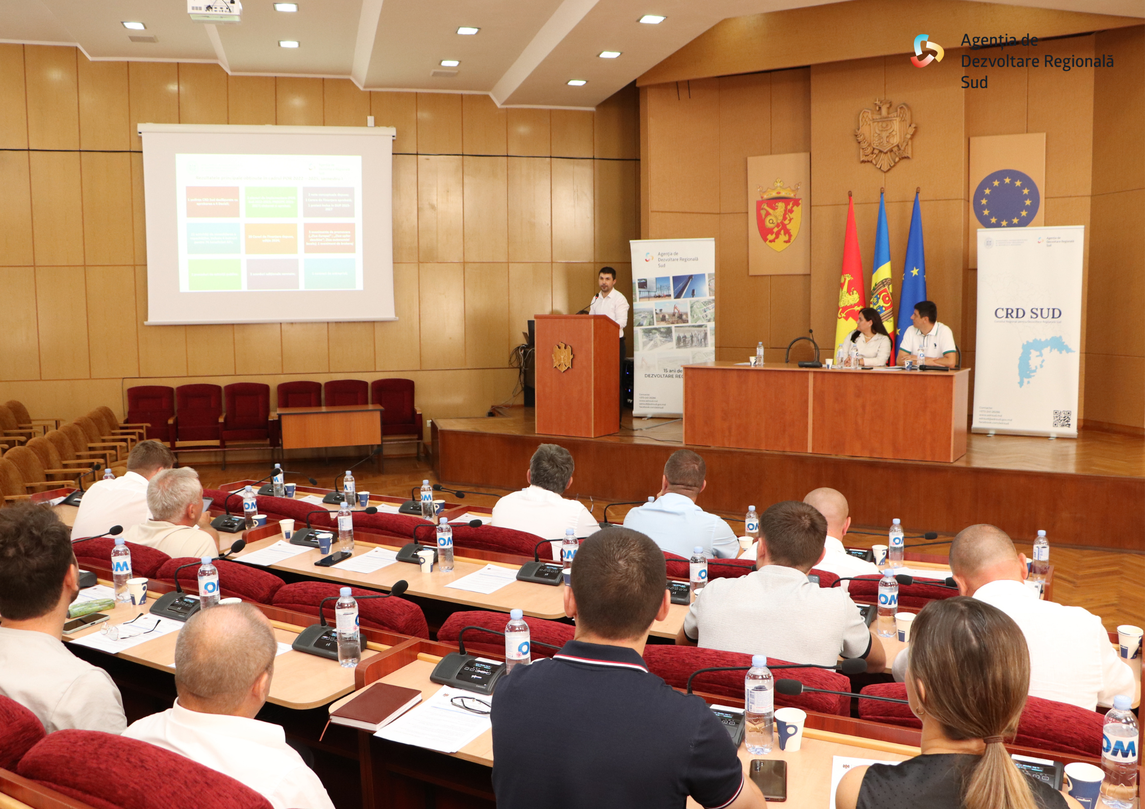 953 Accesări Luni, 11 august 2025, în Sala de Ședințe a Consiliului Raional Cimișlia, a avut loc ședința Consiliului Regional pentru Dezvoltare (CRD) Sud. În deschiderea ședinței, președinta CRD Sud, dna Olga Luchian a subliniat importanța evaluării progresului și a deciziilor ce urmează a fi adoptate. Adițional a evidențiat rolul esențial al finalizării procesului de evaluare a cererilor complete de finanțare, depuse în cadrul Apelului competitiv de selectare a proiectelor de dezvoltare regională cu finanțare din Fondul național pentru dezvoltare regională și locală (FNDRL), ediția 2024, și înaintării listelor proiectelor pentru etapa națională, îndemnând la conlucrare, responsabilitate și obiectivitate în luarea deciziilor. Dl Nicolae Hristov, directorul Agenției de Dezvoltare Regională Sud, a subliniat angajamentul instituției față de obiectivele ambițioase stabilite și a exprimat încrederea în succesul implementării acestora. Astfel, în Raportul de progres prezentat privind implementarea Programului Operațional Regional (POR) Sud 2022-2025 pentru perioada ianuarie-iunie 2025, a evidențiat indicatorii principali și progresul în valorificarea resurselor financiare din (FNDRL), unde a remarcat creșterea semnificativă a sumelor alocate și valorificate pentru proiectele de infrastructură: în doar jumătate de an, s-a reușit valorificarea a 57,9 milioane lei, iar alocările din FNDRL pentru anul 2025 au depășit considerabil anii precedenți (161,5 milioane MDL din FNDRL pentru implementarea proiectelor din Regiune de Dezvoltare Sud). Totodată, a prezentat analiza statutului proiectelor incluse în DUP 2025-2027, stadiul implementării și provocările întâmpinate pe parcurs. Dna Irina Coroian, şefa secției planificare şi cooperare regională, a prezentat subiectul privind includerea unui proiect în domeniul sporirii atractivității turistice în planul de implementare a POR Sud, proiect aplicat de ADR Sud în cadrul concursului de selectare a proiectelor de dezvoltare pentru centrele urbane, apel pe listă, ediția aprilie 2025. Dl Andrei Popușoi, șef secția management integrat al proiectelor, desemnat în rol de secretar al comisiei de evaluare, a expus rezultatele etapei a II-a a Apelului Competitiv 2024 pentru finanțare din FNDRL, menționând cadrul legal aplicabil, domeniile prioritare și condițiile de finanțare, fiind prezentată și procedura de evaluare administrativă și tehnico-financiară. La etapa I a apelului competitiv, au fost depuse 37 de note conceptuale, dintre care 22 au fost admise în etapa II-a a concursului. Până la data de 06 iunie 2025, prin intermediul Sistemului Informațional de gestionare a proiectelor de dezvoltare regională și locală (SI GPDRL), au fost depuse 20 Cereri de finanțare, după cum urmează: Măsura 1.3 Sporirea activității turistice - 5 cereri de finanțare