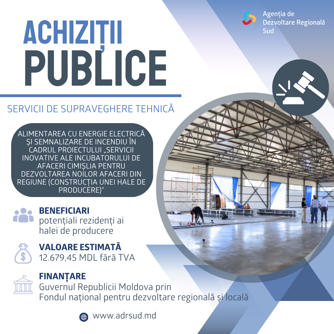 Agenția de Dezvoltare Regională Sud a lansat procedura de achiziție publică pentru servicii de supraveghere tehnică a lucrărilor de alimentare cu energie electrică și semnalizare de incendiu în cadrul proiectului „Servicii inovative ale Incubatorului de Afaceri Cimișlia pentru dezvoltarea noilor afaceri din regiune" (construcția unei hale de producere)". Compania va presta servicii în scopul monitorizării calității și conformității lucrărilor de construcție cu standardele și cerințele tehnice. Proiectul „Servicii inovative ale Incubatorului de Afaceri Cimișlia pentru dezvoltarea noilor afaceri din regiune" include construcția unei hale de producer în orașul Cimișlia, racordarea acesteia la toate utilitățile necesare (apă, canalizare, gaz, energie electrică), precum și amenajarea unui teren adiacent cu o suprafață de 0,39 hectare. Prin realizarea acestui obiectiv, vor fi sprijinite inițiativele antreprenoriale din regiune, principalii beneficiari potențialii rezidenți ai halei de producere, care vor închiria spații prin intermediul Incubatorului de Afaceri Cimișlia. Detalii despre procedura de achiziții: