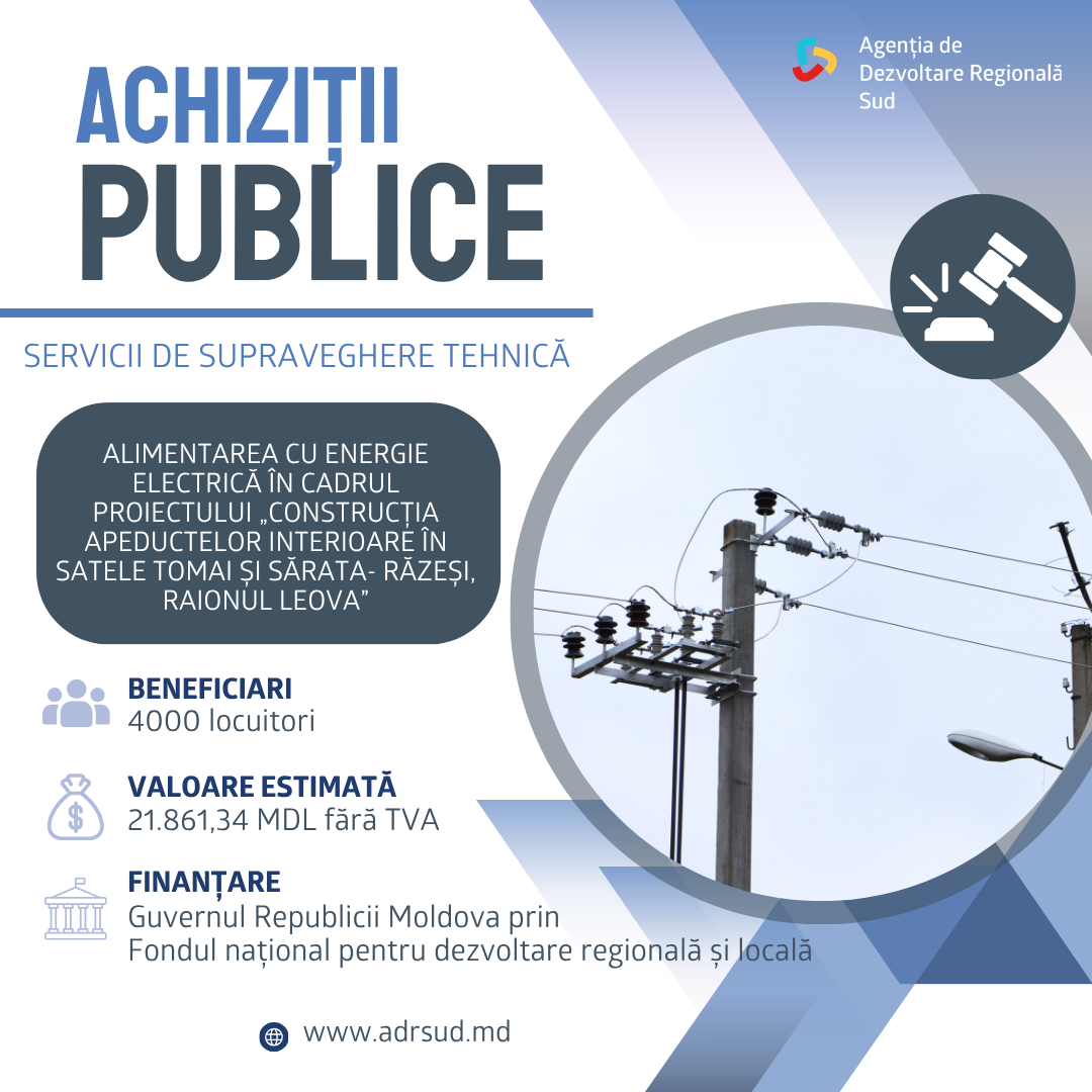 Agenția de Dezvoltare Regională Sud a lansat procedura de achiziție publică pentru servicii de supraveghere tehnică a lucrărilor „Alimentarea cu energie electrică" în cadrul proiectului „Construcția apeductelor interioare în satele Tomai și Sărata- Răzeși, raionul Leova". Compania va presta servicii în scopul monitorizării calității și conformității lucrărilor de construcție cu standardele și cerințele tehnice. Beneficiari direcți în cadrul proiectului menționat vor fi circa 4 mii de locuitori conectați la sistemul de aprovizionare cu apă în localitățile Tomai și Sărata Răzeși, raionul Leova. Indirect, proiectul va oferi posibilitatea de alimentare cu apă din râul Prut pentru circa 7 mii de locuitori din satele Mingir și Voinescu, raionul Hîncești. Detalii despre procedura de achiziții: