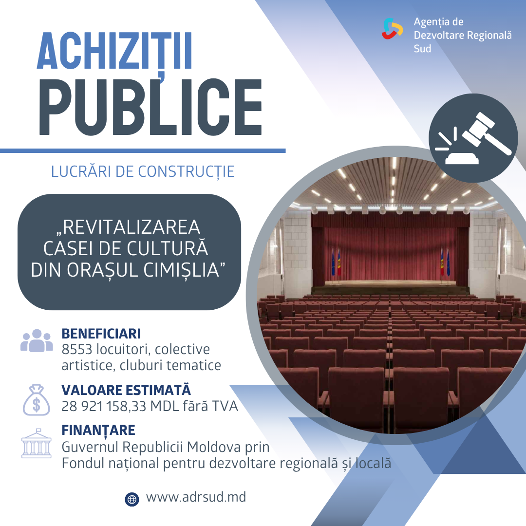 Agenția de Dezvoltare Regională Sud a lansat procedura de achiziție publică pentru lucrări de construcție în cadrul proiectului „Revitalizarea Casei de Cultură din orașul Cimișlia". Compania va desfășura lucrări de reparație a unor încăperi și reconstrucția Sălii de spectacole, vestibulului și vestiarului cu elemente de design interior în Casa de Cultură a or. Cimișlia. Beneficiari direcți în cadrul proiectului menționat vor fi circa 1856 locuitori locuitori din zona de revitalizare, 4 colective artistice, 8 ONG-uri, Centrul raional de Tineret, Clubul jocurilor de societate, clubul amatorilor de tenis de masă etc.