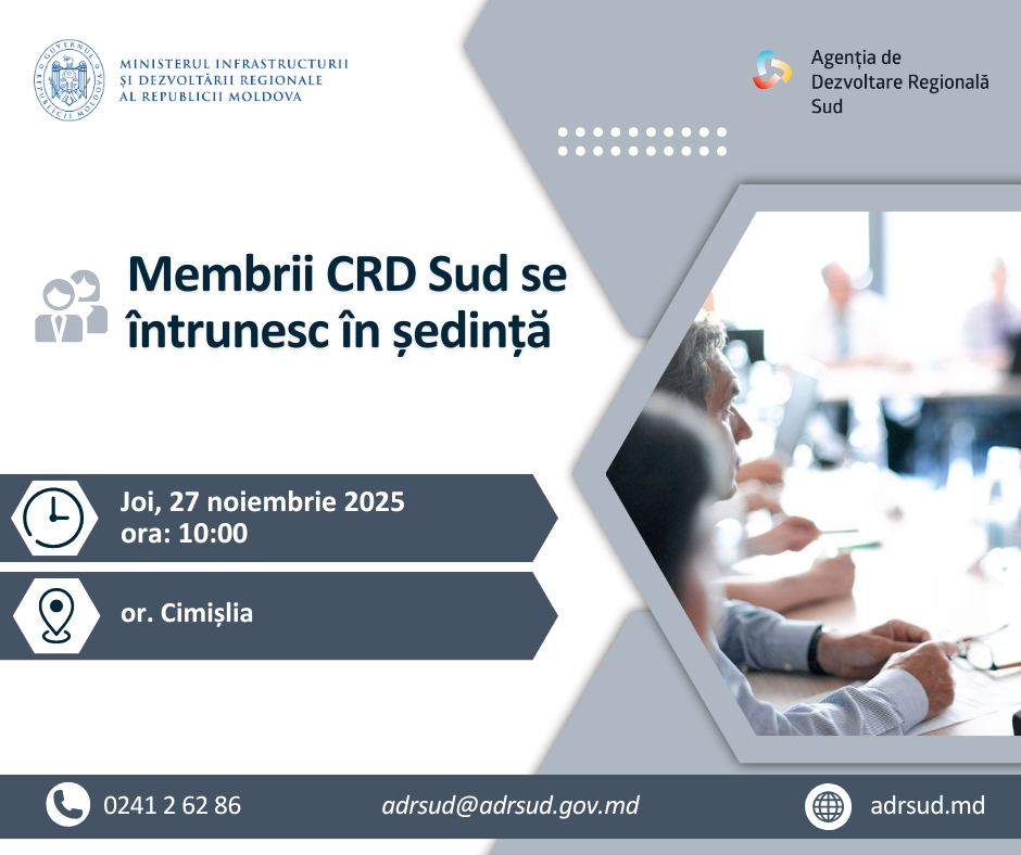 225 Accesări Consiliul Regional pentru Dezvoltare (CRD) Sud se convoacă în ședință extraordinară joi, 27 noiembrie 2025, la Cimișlia, începând cu ora 10:00. În cadrul ședinței urmează a fi: