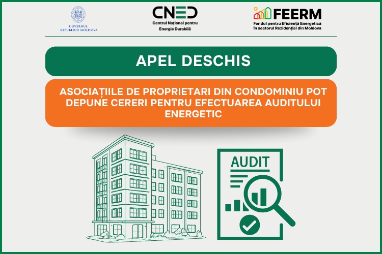 Centrul Național pentru Energie Durabilă (CNED) anunță lansarea apelului de depunere a cererilor de participare pentru efectuarea Rapoartelor de audit energetic pentru blocurile locative multietajate gestionate de Asociațiile de Proprietari din Condominiu (APC). Scopul acestui apel este de a sprijini APC-urile în evaluarea consumului actual de energie și identificarea soluțiilor eficiente de reducere a acestuia, prin implementarea măsurilor de eficiență energetică și valorificarea surselor regenerabile de energie. APC-urile care vor beneficia de suport în elaborarea raportului de audit energetic vor putea accesa, ulterior, finanțare pentru elaborarea documentației de proiect cât și implementarea măsurilor de eficiență energetică și valorificarea surselor de energie regenerabilă, co-finanțate prin programul guvernamental FEERM. „Evoluțiile acestui produs de finanțare din cadrul programului guvernamental FEERM ne-a determinat să intervenim cu unele ajustări pentru a oferi mai multă flexibilitate potențialilor beneficiari dar și o valorificare mai eficientă a bugetului alocat în acest sens. Totodată, intrarea în faza de implementare reală a proiectelor ne permite să ne axăm eforturile în scalarea produsului pentru a ajunge la cât mai mulți beneficiari care să poată să-și reducă pierderile de căldură, diminueze facturile la energie și să-și sporesc confortul.", a declarat Ion Muntean, directorul Centrului Național pentru Energie Durabilă. Asociațiile de Proprietari din Condominiu care vor beneficia de Raportul de audit energetic vor fi eligibile pentru Componenta II - documentație de proiect, conform produsului de finanțare „Eficiența energetică a blocurilor locative", iar ulterior de a aplica la Componenta III - lucrări de construcții și obținerea unui grant de până la 70% din valoarea investiției eligibile prin Fondul pentru Eficiență Energetică în sectorul Rezidențial din Moldova (FEERM). Contribuția locatarilor reprezintă 30%. De asemenea, în funcție de gradul de vulnerabilitate energetică, proprietarii pot beneficia suplimentar de alocații din Fondul de Reducere a Vulnerabilității Energetice, acoperind între 15% și 90% din contribuția proprie. Pentru elaborarea Raportului de audit energetic APC va achita, în avans, o contribuție inițială de 10% din costul total al serviciului. Totodată, APC-urile care beneficiază de finanțare pentru auditul energetic trebuie să continue implementarea proiectului, participând la elaborarea documentației de proiect și executarea lucrărilor de construcții pentru realizarea măsurilor de reabilitare energetică a blocului locativ. În cazul în care APC nu depune cererea de finanțare pentru elaborarea documentației de proiect, aceasta va restitui integral costul Raportului de audit energetic suportat de CNED. Noutatea acestui apel este că sunt eligibile și clădirile date în exploatare după 2005, dacă acestea nu au implementat anterior lucrări de izolare termică a pereților și/sau acoperișului. Pentru a fi eligibilă în cadrul prezentului apel, fiecare APC trebuie să îndeplinească cumulativ următoarele criterii: