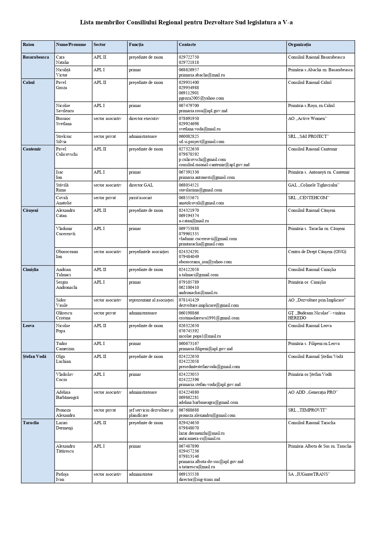 Lista membrilor Consiliului Regional pentru Dezvoltare Sud legislatura a V-a